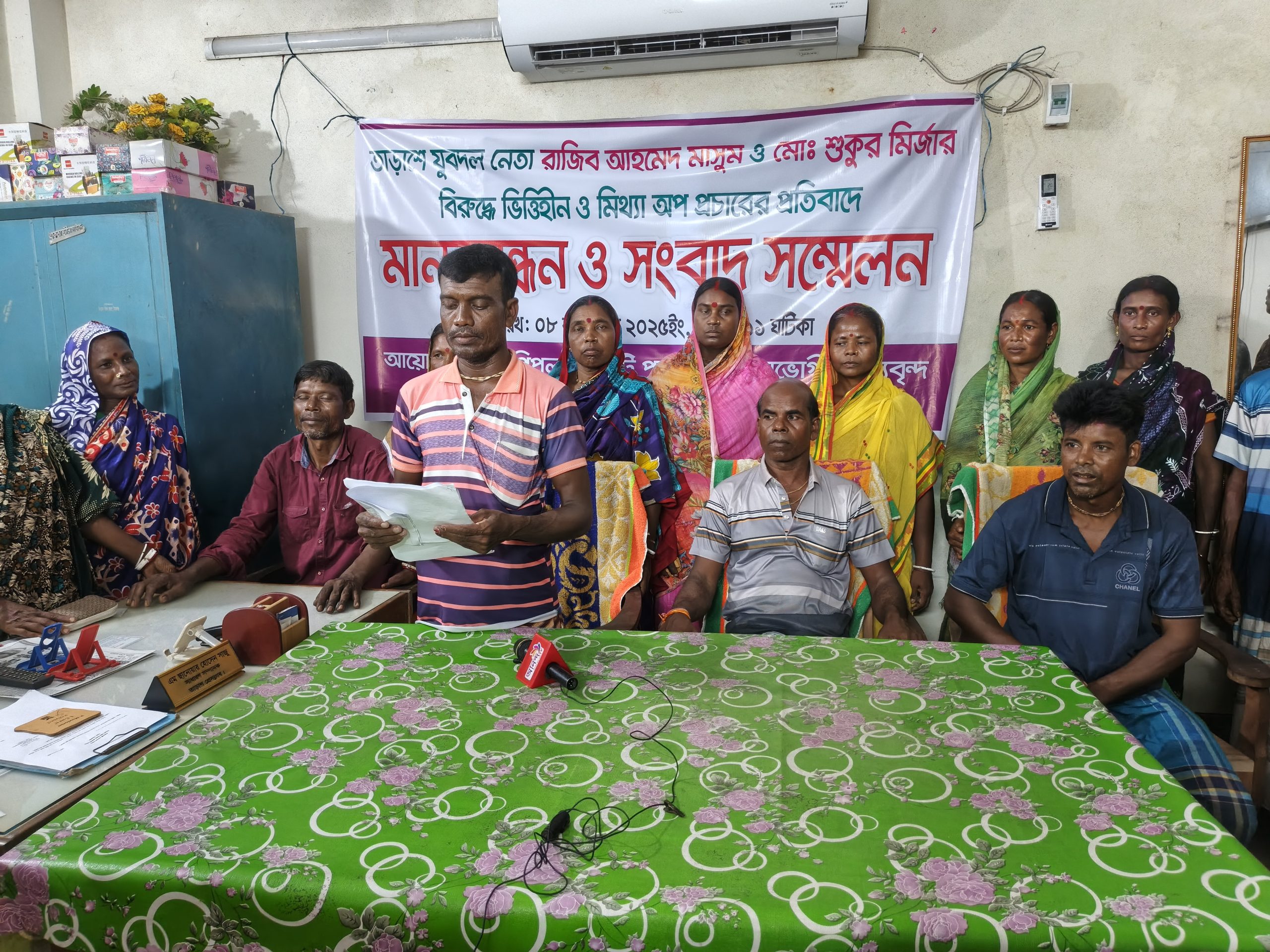 সিরাজগঞ্জের তাড়াশে যুবদল নেতা রাজিব আহম্মেদ মাসুম ও শুকুর মির্জার বিরুদ্ধে সুফলভোগীদের পুকুর জোড় করে ভোগদখলের ভিত্তিহীন ও মিথ্যা অপ-প্রচারের প্রতিবাদে সংবাদ সম্মেলন করেছেন গুড়পিপুল ছয়ঘাটি পুকুরের সুফলভোগী আদিবাসী নারী-পুরুষেরা।