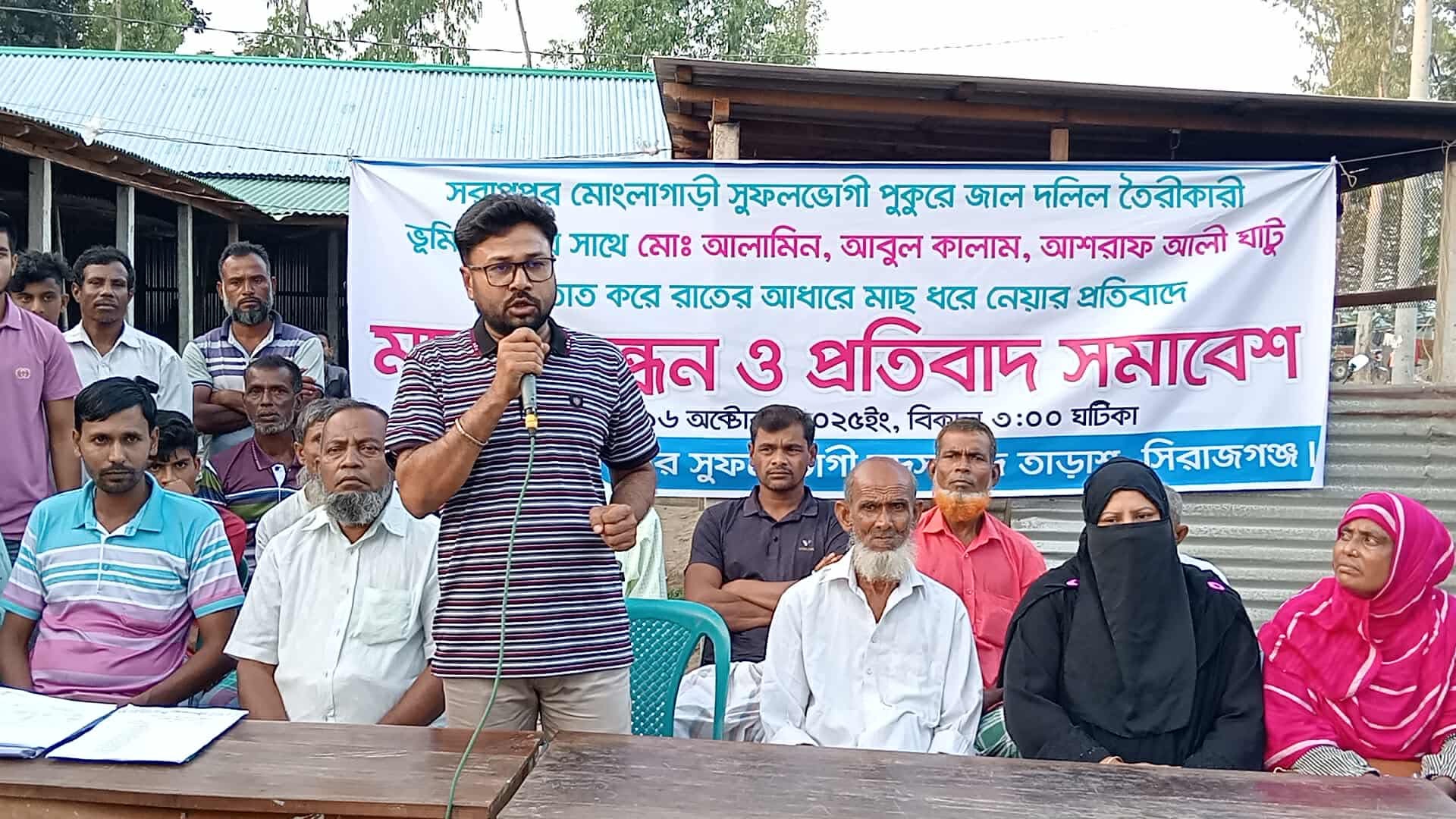 সিরাজগঞ্জের তাড়াশে সরাপপুর মোংলাগাড়ী সুফলভোগী পুকুরের জাল দলিল তৈরী ও রাতের আধারে মাছ ধরে নেয়ার প্রতিবাদে মানববন্ধন ও প্রতিবাদ সমাবেশ অনুষ্ঠিত হয়েছে।
