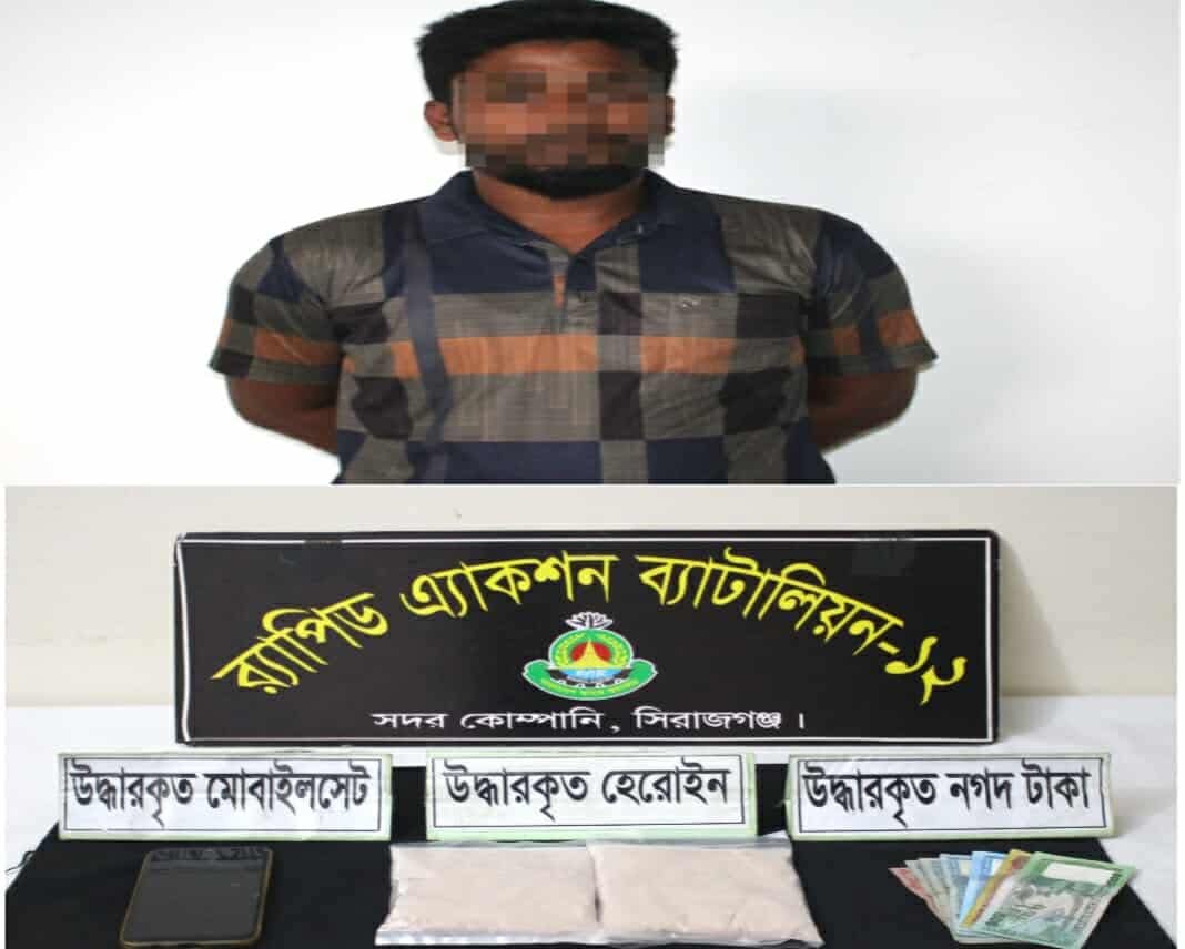 সিরাজগঞ্জে সলঙ্গা থানা এলাকায় অভিযান চালিয়ে ৩১১ গ্রাম হেরোইনসহ ১ মাদক ব্যবসায়ীকে গ্রেফতার করেছে র্যাব-১২ র সদস্যরা। শুক্রবার (১৭ অক্টোবর) বিকেল ৪.৪৫ মিনিটের দিকে গোপন সংবাদে ভিত্তিতে র্যাব-১২’র সদর কোম্পানির একটি চৌকষ আভিযানিক দল সিরাজগঞ্জ জেলার সলংগা থানাধীন নলকা ওভার ব্রিজ এর উত্তর পার্শ্বে সিরাজগঞ্জগামী মহাসড়কের উপর” একটি মাদক বিরোধী অভিযান পরিচালনা করে ৩১১ গ্রাম হেরোইনসহ ০১ জন মাদক ব্যবসায়ীকে গ্রেফতার করতে সক্ষম হয়। এছাড়াও তার সাথে থাকা হেরোইন ক্রয়-বিক্রয় কাজে ব্যবহৃত ০১টি মোবাইল ফোন এবং নগদ ১১১০/- টাকা জব্দ করা হয়। র্যাব-১২ সদর কোম্পানি কমান্ডার অতিরিক্ত পুলিশ সুপার, দীপংকর ঘোষ স্বাক্ষরিত প্রেসবিজ্ঞপ্তিতে এ তথ্য নিশ্চিত করা হয়েছে। গ্রেফতারকৃত আসামি হলেন, মোঃ লিটন (৩০), পিতা- মোঃ নজরুল ইসলাম, সাং-দিয়ার মানিক চক, থানা- গোদাগাড়ী, জেলা-রাজশাহী।
