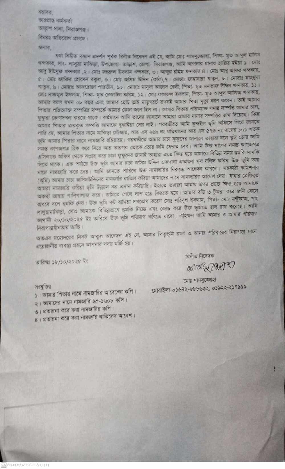 সিরাজগঞ্জের তাড়াশ উপজেলার সুগনা ইউনিয়নের লালুয়া মাঝিড়া গ্রামের মৃত আব্দুল হালিমের ছেলে মোঃ শামসুজ্জোহা তার পিতৃসম্পত্তি রক্ষায় জীবননাশের হুমকির মুখে পড়েছেন বলে অভিযোগ করেছেন। এ বিষয়ে তিনি শনিবার (১৮ অক্টোবর) ভাড়াশ থানায় লিখিত অভিযোগ দাখিল করেছেন।