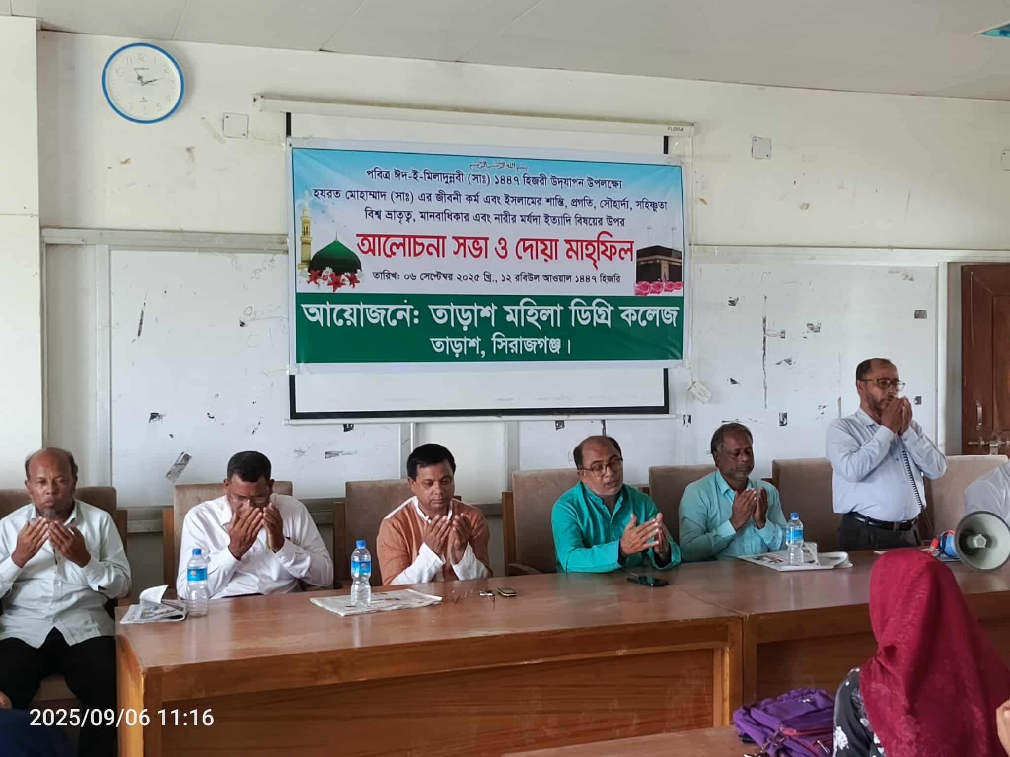 অনুষ্ঠানে সভাপতিত্ব করেন কলেজের অধ্যক্ষ মো. জাফর ইকবাল। আলোচনা সভায় অংশ নেন অত্র কলেজের উপাধাক্ষ্য শাহাদত হোসেন, ইতিহাস বিভাগের সহকারী অধ্যাপক ও তাড়াশ প্রেসক্লাবের সভাপতি সাব্বির আহম্মেদ, হিসাব বিজ্ঞান বিভাগের প্রভাষক আরিফুর রহমান। হামদ-নাত পরিবেশনা করেন কলেজের একাদশ শ্রেণির ছাত্রী রিচি খাতুন ও হাফসা খাতুন । এ সময় বক্তারা মানবতার মুক্তিদূত, বিশ্বনবী হযরত মুহাম্মদ (সা.)-এর জীবনদর্শন নিয়ে আলোকপাত করেন। তারা বলেন, মহানবী (সা.)-এর আদর্শ অনুসরণ করলেই দুনিয়া ও আখিরাতে সফলতা অর্জন করা সম্ভব।